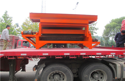 2、矿粒经输送皮带被送进上磁辊选别,因为褐铁矿,褐铁矿,氧化锰,炭酸锰矿的矿粒有磁性,马上被强磁场吸咐在磁辊上,脉石粒(杂石、碎石土)因为沒有磁性(磁性太弱),磁辊的强磁铁对它不发病吸附力,跟随磁辊的更改,矿粒一向被吸在磁辊上,而脉石粒在磁辊转到前端开发方向时被抛出去掉在隔矿板的前边(根据修改隔矿板视角的尺寸可调节精矿的层级),矿粒再次被磁辊送到脱磁区时全自动跌入一选集矿斗搜集为精矿制成品。