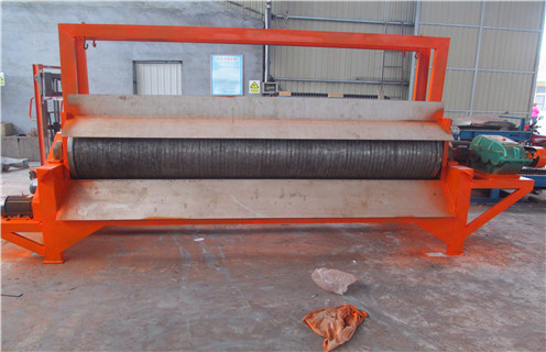 2、矿粒经输送带被送入上磁辊分选,由于铁矿的矿粒有磁性,立即被强磁场吸附在磁辊上,脉石粒由于没有磁性,磁辊的强磁对它不产生吸力,随着磁辊的转动,矿粒一直被吸在磁辊上,而脉石粒在磁辊转到前端位置时被抛出掉在隔矿板的前面,矿粒继续被磁辊带到脱磁区时自动掉入一选集矿斗收集为精矿成品。